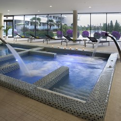 The hotel has a spa with a hot tub, sauna, outdoor pool and a range of treatments. There is also a golf school, tennis courts, paddle courts and a fitness centre.