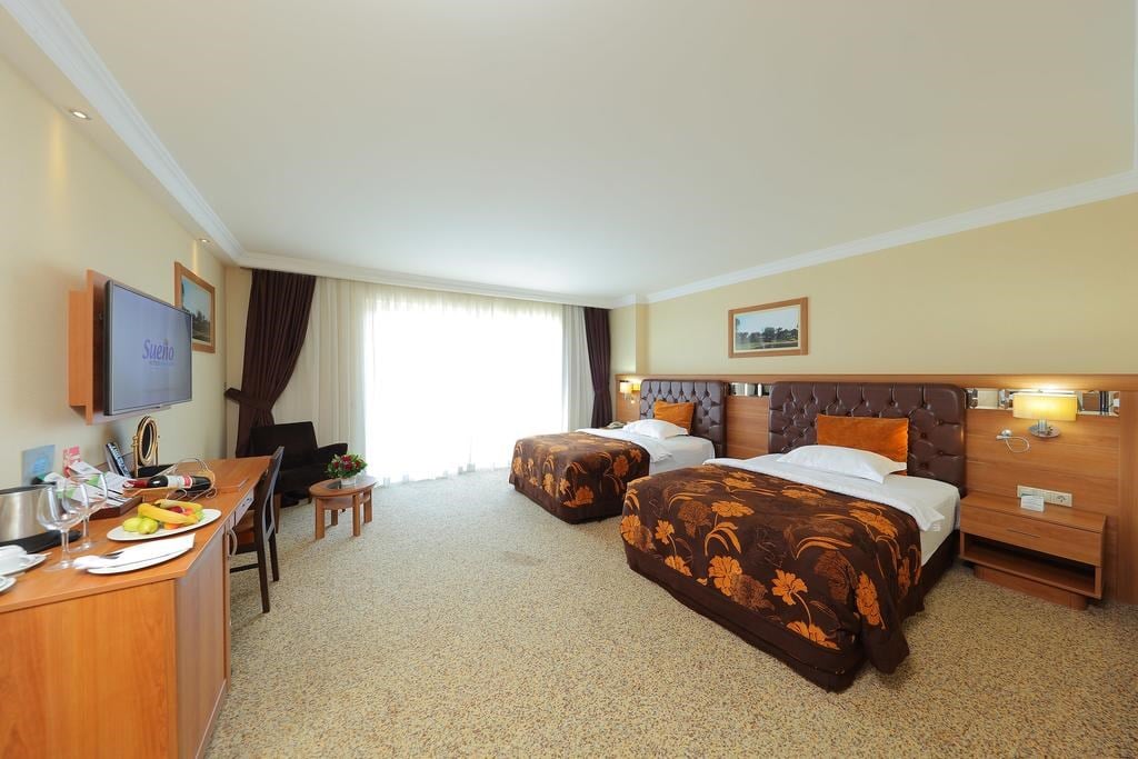 Sueno Hotels Golf Belek’s rooms are spacious and decorated in autumn colours. Each one has a seating area with flat-screen satellite TV and plush armchairs joining up with a furnished balcony.